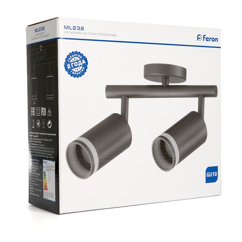 Светильник накладной под лампу, (ИВО) FERON ML232, 2*GU10 2*50W, 230V, IP20, цвет черный, корпус алюминий, 240*56*210