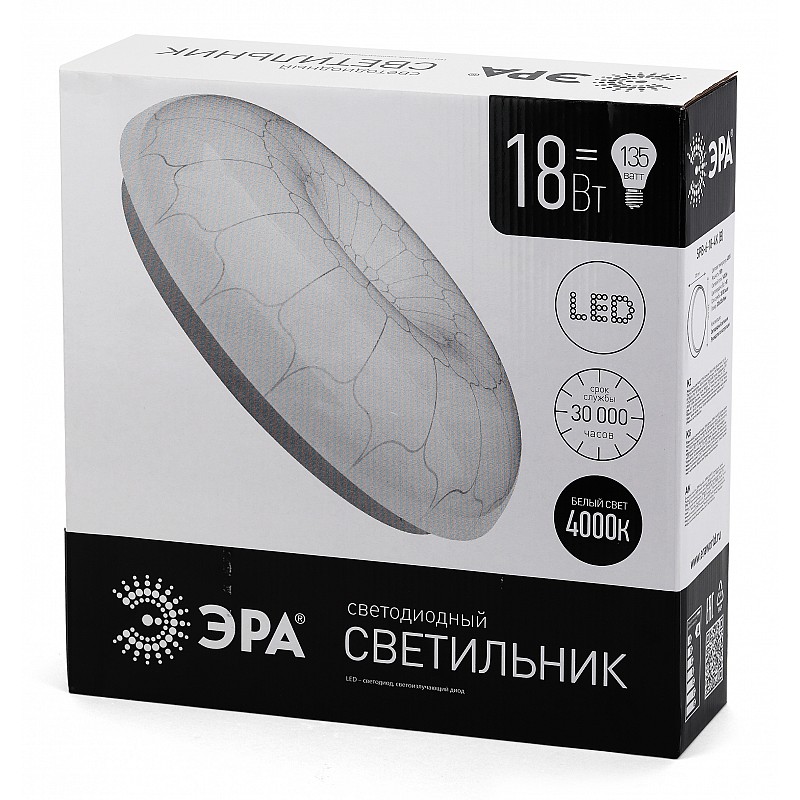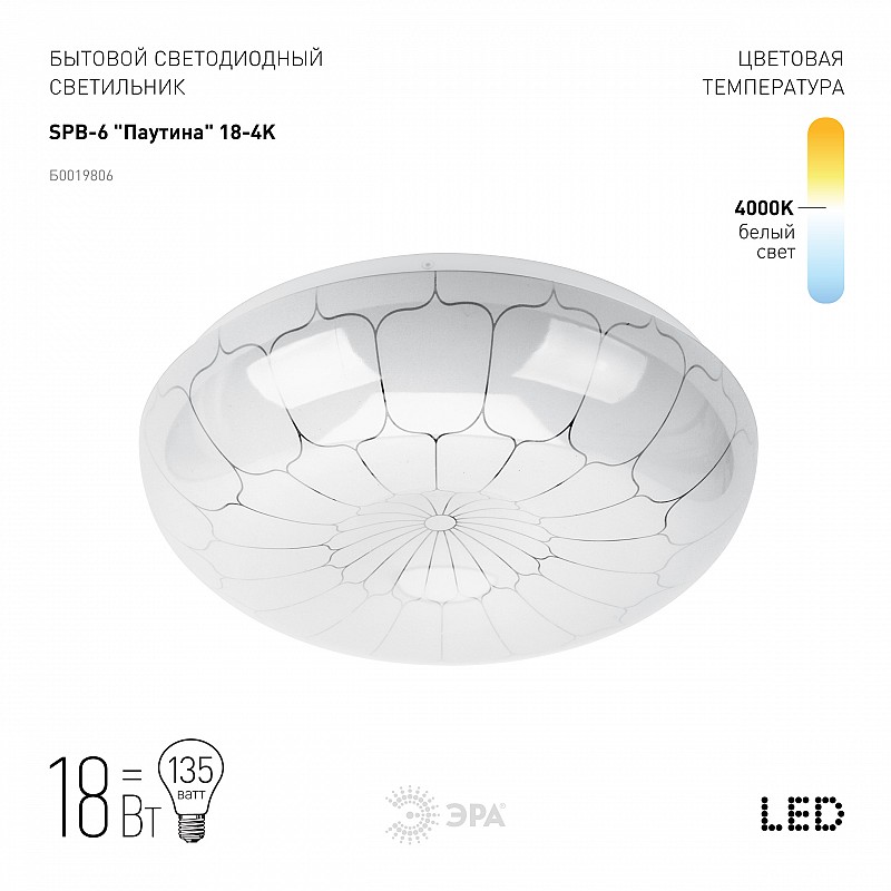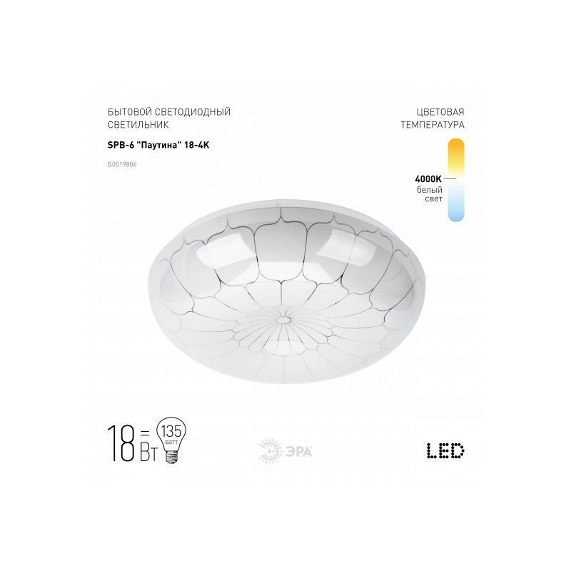 Нежный потолочный светильник SPB-6 "Паутина" мощностью 18 Вт придаст неповторимый стиль Вашему дому! Габариты LED люстры 335х98 мм позволят ей вписаться в помещение любой площади.<br/><br/>Симметричное распределение света обеспечивается благодаря матовому плафону из пластика. Световая температура в 4000 К с нежным белым свечением защищает глаза и придает помещению элегантности.<br/><br/>Главное преимущество электросветильника - основание из алюминия. За счет отличного теплоотвода сохраняется срок эксплуатации.<br/><br/>Эксклюзивность LED люстры заключается в дизайне рассеивателя. Рисунок, напоминающий паутину, органично смотрится на выпуклом круглом корпусе. За счет этого потолочный светильник будет идеально смотреться в гостиной, спальне или детской.<br/><br/>Мощность в 18 Вт и срок службы в 30 000 часов обеспечат долгую работу SPB-6 "Паутина". Приобретайте светодиодную люстру от компании ЭРА создавайте уникальный стиль!