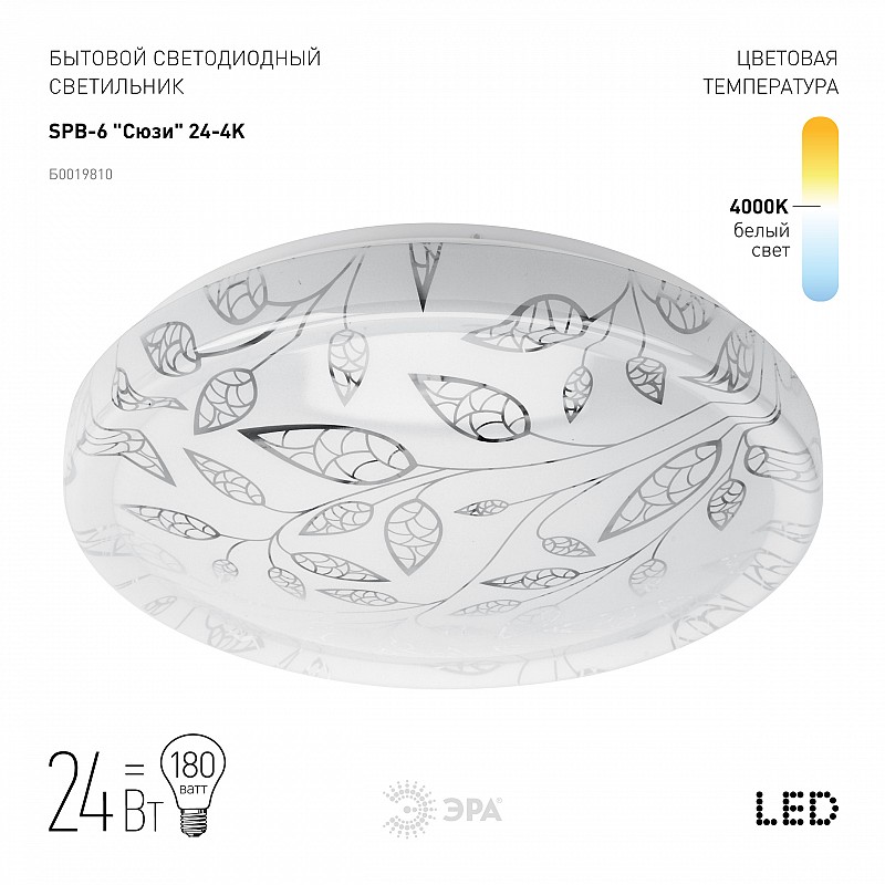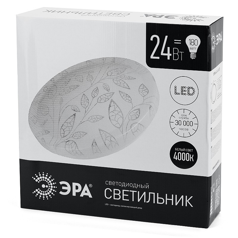 Светодиодный потолочный светильник SPB-6 "Сюзи" мощностью 24 Вт от производителя ЭРА идеальный выбор для Вашего интерьера! LED люстра гармонично украсит любое пространство, ее габариты 385х103 мм.<br/><br/>За счет матового рассеивателя из пластика обеспечивается правильное распределение света. Цветовая температура в 4000 К заполнит пространство приятным белым свечением, успокаивающим глаза. <br/><br/>Важное преимущество потолочного светильника - алюминиевое основание. Оно обеспечивает продолжительный срок службы за счет хорошего теплоотвода.<br/><br/>Плафон LED люстры декорирован изящным узором. Нежные ветки с лепестками гармонично смотрятся на круглом плоском корпусе. Такой светильник прекрасно подойдет для оформления гостиной, коридора, спальни или детской.<br/><br/>Мощность в 24 Вт и срок службы в 30 000 часов позволят использовать электросветильник SPB-6 "Сюзи" долгое время! Примите верное решение и купите люстру от бренда ЭРА!