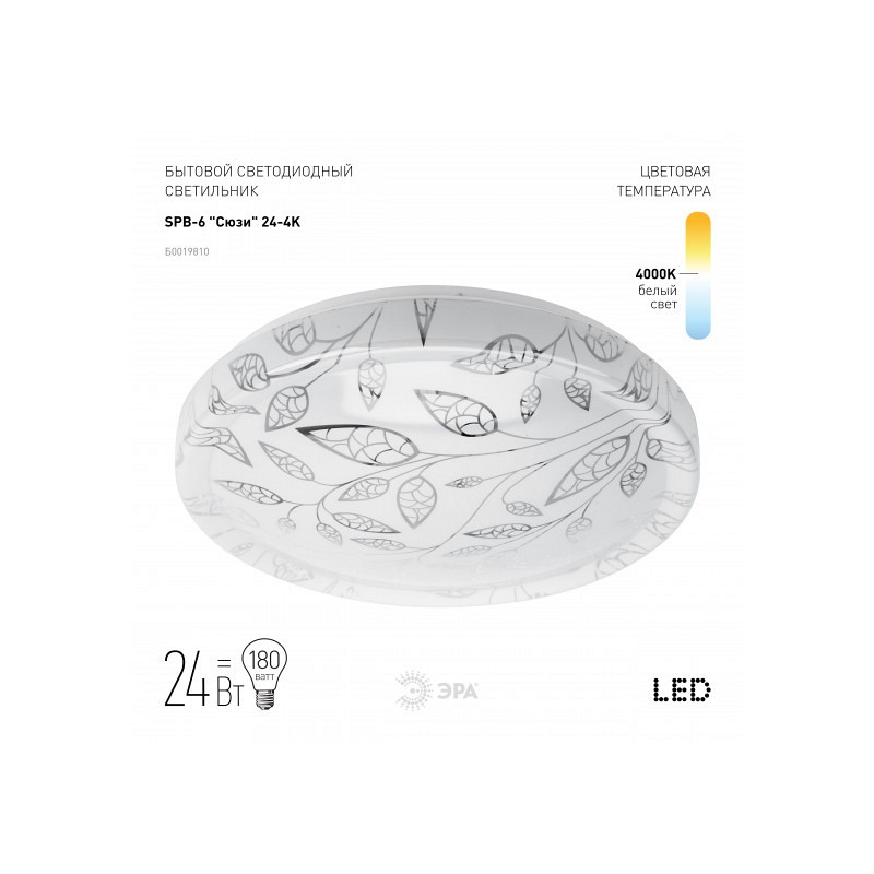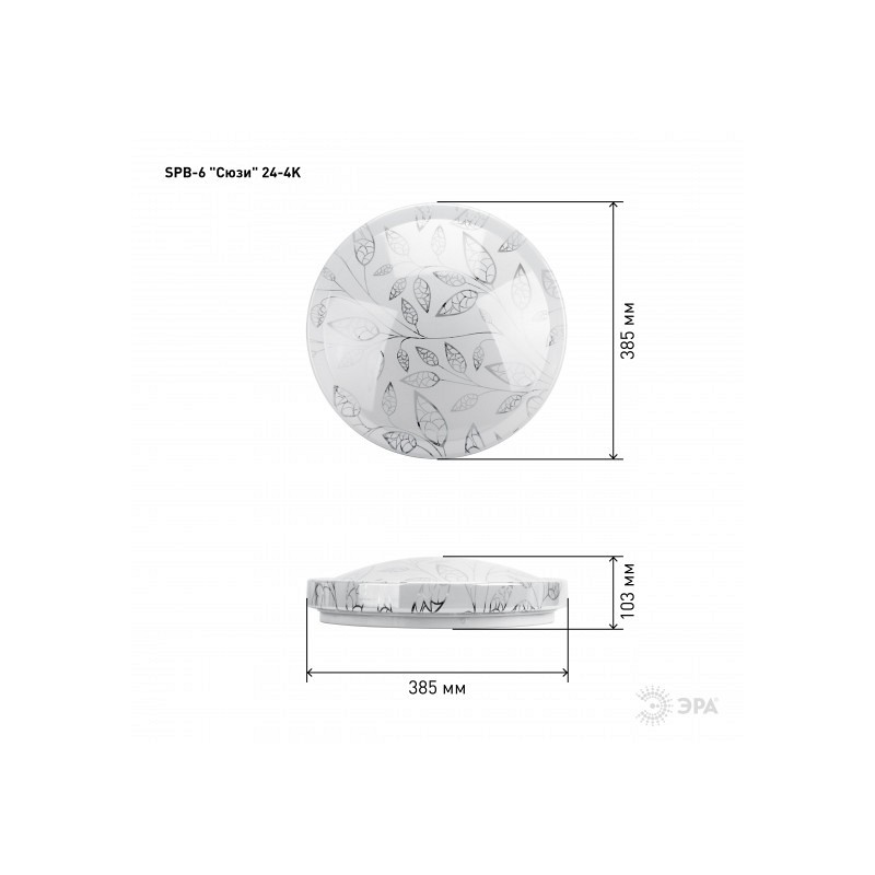 Светодиодный потолочный светильник SPB-6 "Сюзи" мощностью 24 Вт от производителя ЭРА идеальный выбор для Вашего интерьера! LED люстра гармонично украсит любое пространство, ее габариты 385х103 мм.<br/><br/>За счет матового рассеивателя из пластика обеспечивается правильное распределение света. Цветовая температура в 4000 К заполнит пространство приятным белым свечением, успокаивающим глаза. <br/><br/>Важное преимущество потолочного светильника - алюминиевое основание. Оно обеспечивает продолжительный срок службы за счет хорошего теплоотвода.<br/><br/>Плафон LED люстры декорирован изящным узором. Нежные ветки с лепестками гармонично смотрятся на круглом плоском корпусе. Такой светильник прекрасно подойдет для оформления гостиной, коридора, спальни или детской.<br/><br/>Мощность в 24 Вт и срок службы в 30 000 часов позволят использовать электросветильник SPB-6 "Сюзи" долгое время! Примите верное решение