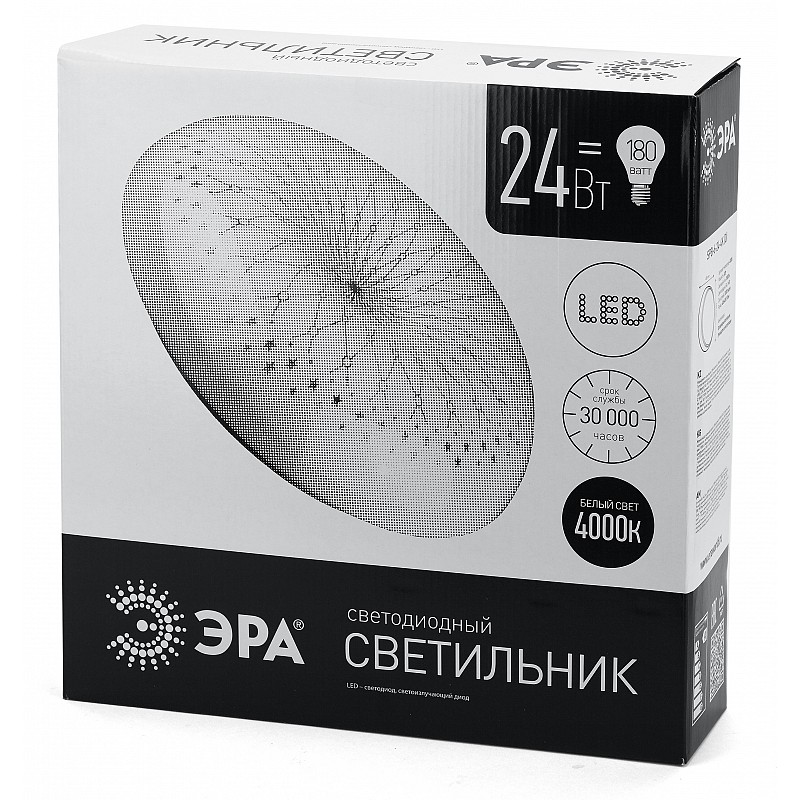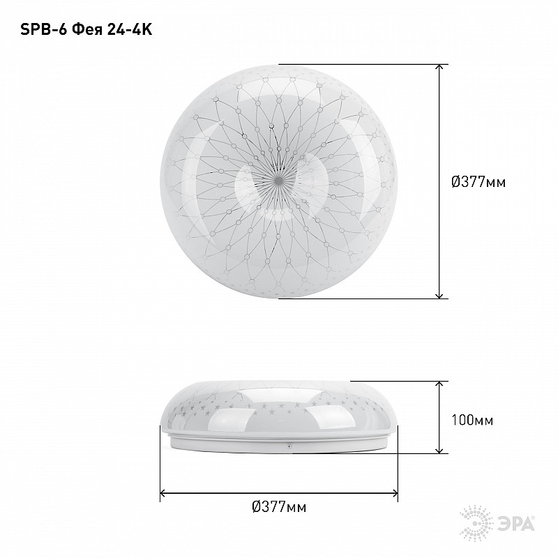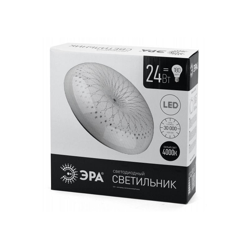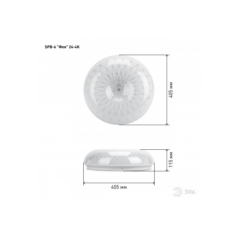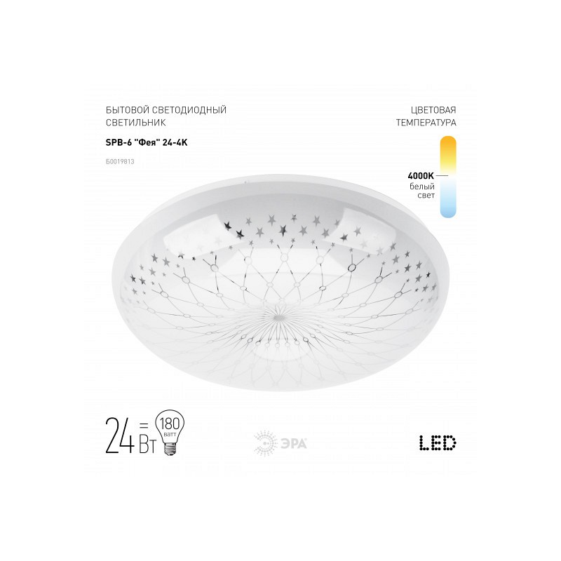 Светодиодный потолочный светильник SPB-6 "Фея" от компании ЭРА идеальный вариант для освещения Вашего пространства! Внешние размеры 405*115 мм позволяют гармонично разместить LED люстру в любом помещении.<br/><br/>За счет рассеивателя из непрозрачного пластика обеспечивается симметричное распределение светового потока. Цветовая температура в 4000 К окутает пространство белым светом, не раздражающим глаза. <br/><br/>Восхитительный дизайн плафона создаст приятную обстановку в Вашем доме. Узор из переплетающихся линий прекрасно сочетается с круглым плоским корпусом. Крохотные звезды, разбросанные по окружности рассеивателя, придают светильнику динамики. Такая LED люстра идеальна для оформления света детской, гостиной или спальне.<br/><br/>Мощность в 24 Вт и срок службы в 30 000 часов подарят долгую и бесперебойную работу электросветильника SPB-6 "Фея". Купите потолочную люстру ЭРА воплощайте любые идеи!