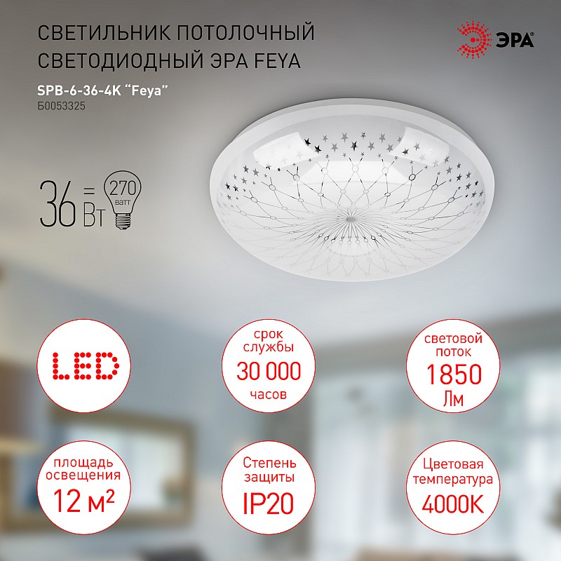 <p>Светодиодный потолочный светильник SPB-6 "Фея" от компании ЭРА идеальный вариант для освещения Вашего пространства! Ееразмеры позволяют гармонично разместить в любом помещении.<br />
