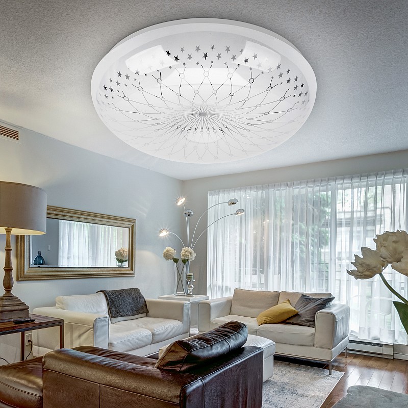 Восхитительный дизайн плафона создаст приятную обстановку в Вашем доме. Узор из переплетающихся линий прекрасно сочетается с круглым плоским корпусом. Крохотные звезды, разбросанные по окружности рассеивателя, придают светильнику динамики. Такая LED люстра идеальна для оформления света детской, гостиной или спальне.<br />