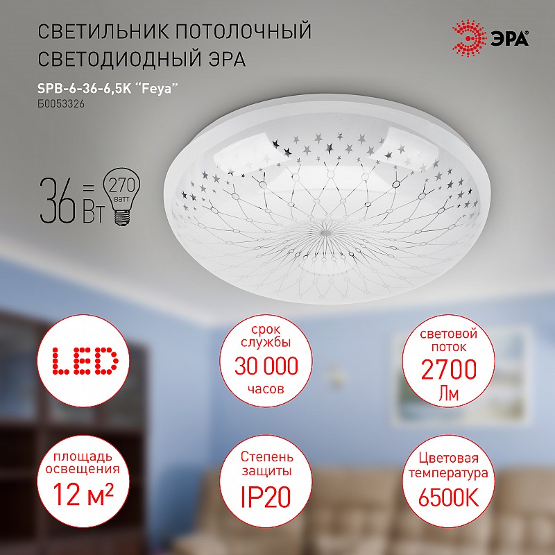 <p>Светодиодный потолочный светильник SPB-6 "Фея" от компании ЭРА идеальный вариант для освещения Вашего пространства! Ее размеры позволяют гармонично разместить в любом помещении.<br />