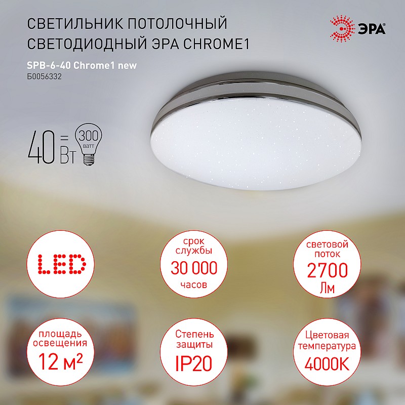 SPB-6-40 Chrome1 new Светильник потолочный светодиодный ЭРА Классик без ДУ SPB-6-40 Chrome1 40 Вт 4000К