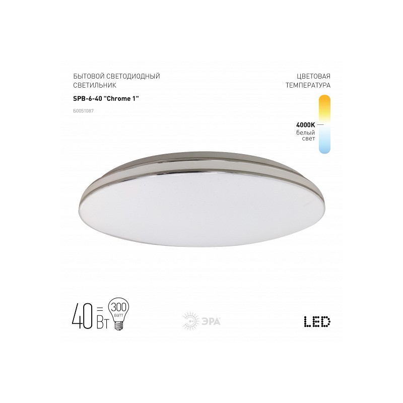<p>Светодиодный светильник потолочный ЭРА SPB-6-40 серии Chrome 1 выполнен в классическом, минималистичном стиле. Его корпус украшен хромированными элементами, рассеиватель декорирован в стиле звездного неба. Белый потолочный светильник гармонично впишется практически в любой интерьер, его минималистичный стиль одинаково удачно дополнит дизайн как кухни, так и спальни. Основание светильника составляет металлическая база с встроенным LED-модулем. Диаметр светильника составляет компактные 38 см, мощность лампы 40 Вт, цветовая температура составляет 4000 К. Благодаря своим характеристикам светодиодный светильник ЭРА будет стильным источником света с комфортной яркостью.</p>