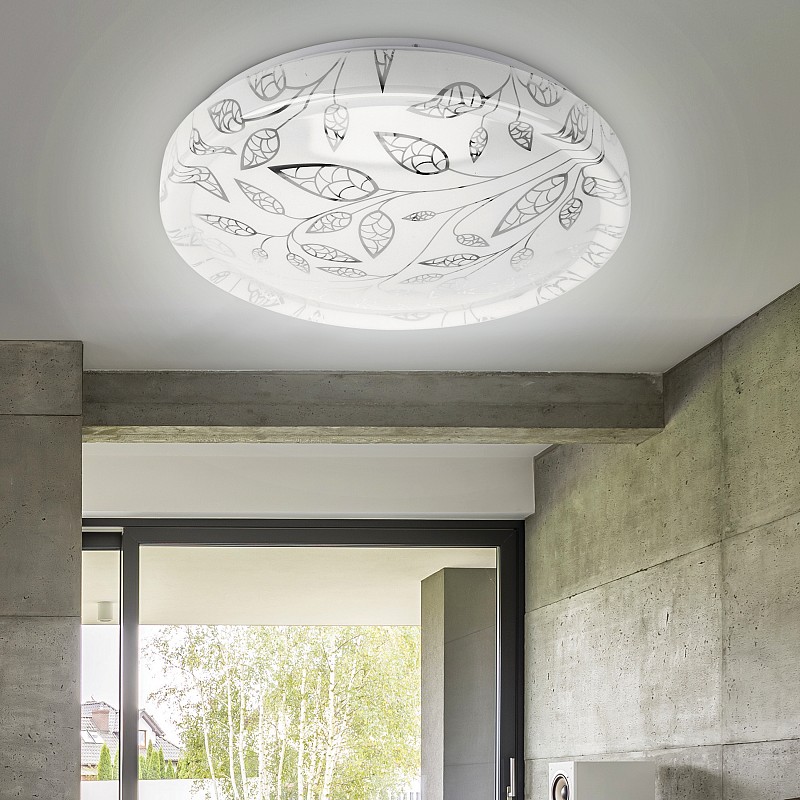 Плафон LED люстры декорирован изящным узором. Нежные ветки с лепестками гармонично смотрятся на круглом плоском корпусе. Такой светильник прекрасно подойдет для оформления гостиной, коридора, спальни или детской.<br />