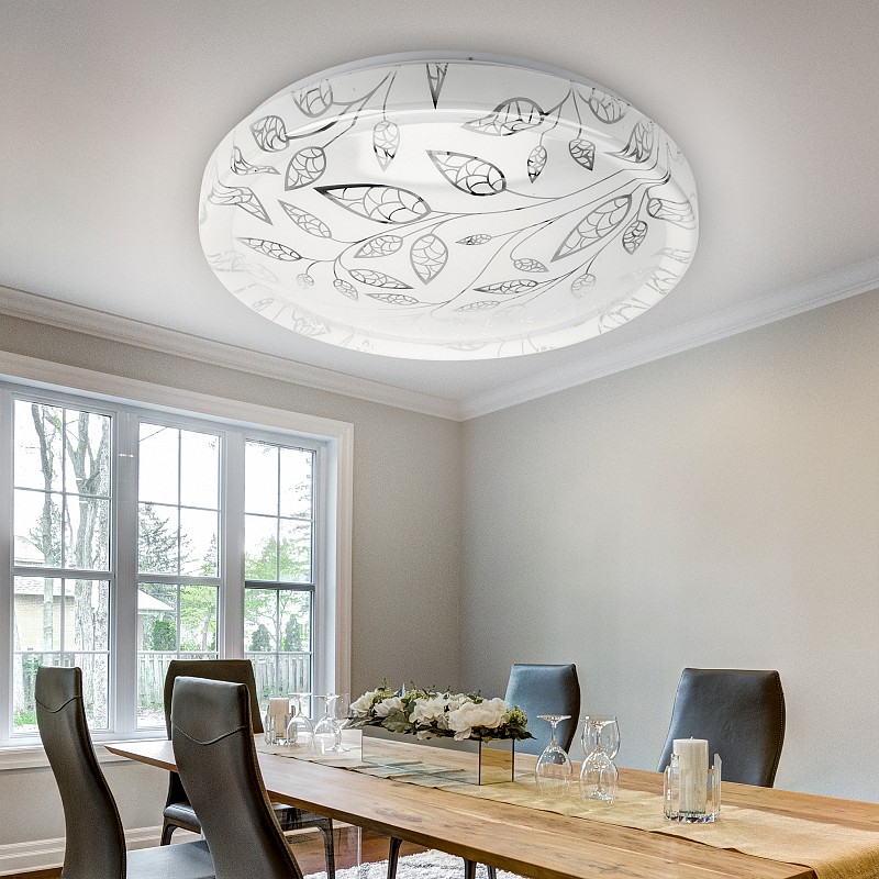 Плафон LED люстры декорирован изящным узором. Нежные ветки с лепестками гармонично смотрятся на круглом плоском корпусе. Такой светильник прекрасно подойдет для оформления гостиной, коридора, спальни или детской.<br />