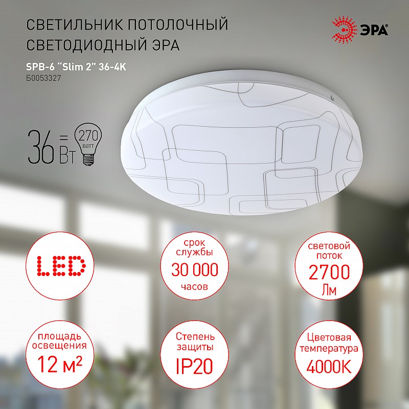 <p>Потолочный светильник SPB-6 "Slim 2" 36-4K от бренда ЭРА в нежном белом оттенке придаст уюта любому интерьеру! Стальной корпус светодиодной люстры обладает противоударными свойствами и отделан глянцем. <br />Электросветильник оснащён светодиодом с нейтральным холодно-белым свечением. LED светильник имеет мощность 36 Вт и равномерное светораспределение.<br />Плафон потолочной люстры выполнен из матового пластика, защищающего от воздействия прямого света. Рассеиватель имеет неповторимый дизайн: декоративный узор серебряного цвета изящно дополняет круглый плоский корпус. Это позволяет использовать SPB-6 "Slim 2" 36-4K в качестве освещения для кухни, прихожей, гостиной.<br />Светодиодная люстра имеет средний срок службы в 30 000 часов и I класс защиты заземление. Данный источник света прослужит Вам долго и бесперебойно. Купить светильник от компании ЭРА значит выбрать высокое качество по оптимальной цене!<br /> <