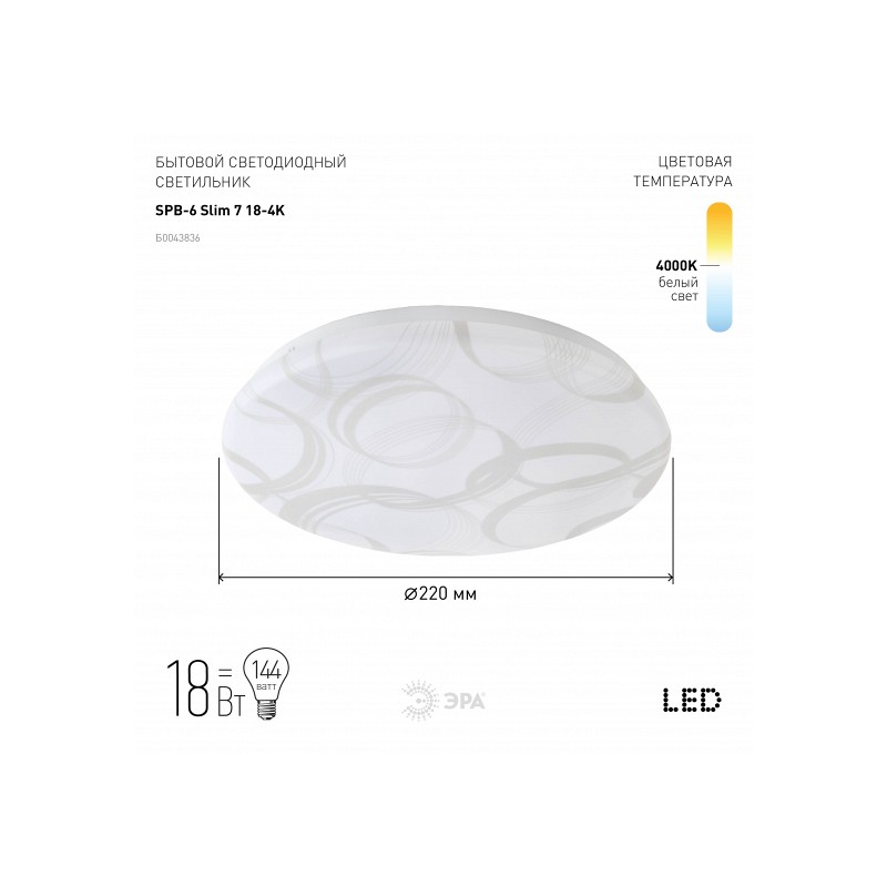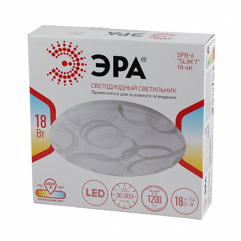 Светодиодный потолочный светильник SPB-6 "Slim 7" мощностью 18 Вт от производителя ЭРА в белом цвете подойдет любому интерьеру! Наружный диаметр составляет 21 см, что подходит для пространств с различной площадью. <br/><br/>Прочность LED люстры достигается за счет стального корпуса. Он обладает мощными противоударными свойствами и имеет долгий срок службы.<br/><br/>Холодно-белое свечение в 4000 К не раздражает глаза. За счет плафона из матового пластика обеспечивается равномерное распределение света. <br/><br/>Рассеиватель имеет неповторимый дизайн: геометричный узор из колец различной толщины в серебристом оттенке изящно гармонирует с круглым плоским корпусом. Это позволяет использовать SPB-6 "Slim 7" для потолочного освещения кухни, спальни, гостиной или детской.<br/><br/>Светодиодная люстра имеет срок службы в 30 000 часов и I класс защиты заземление. Купив светильник от компании ЭРА, Вы получите высокое качество по лучшей цене!