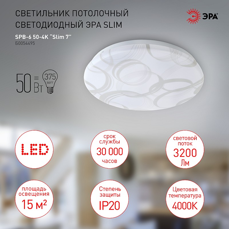 <p>Потолочный светильник SPB-6 "Slim 7" мощностью 50 Вт от бренда ЭРА в нежном белом оттенке надежно впишется в любое дизайнерское решение! Стальной корпус светодиодной люстры обладает мощными противоударными свойствами и отделан глянцем. <br />Мягкое белое свечение в 4000 К не раздражает глаза. Симметричное распределение света достигается за счет плафона из матового пластика.<br />Рассеиватель имеет эксклюзивный дизайн: геометричный узор из колец различной толщины серебристого оттенка изящно гармонирует с круглым плоским корпусом. Это позволяет использовать SPB-6 "Slim 7" в качестве освещения для кухни, спальни или гостиной.<br />Светодиодная люстра имеет средний срок службы в 30 000 часов и I класс защиты заземление. Приобретайте светильник от компании ЭРА и выбирайте высокое качество по оптимальной цене!</p>