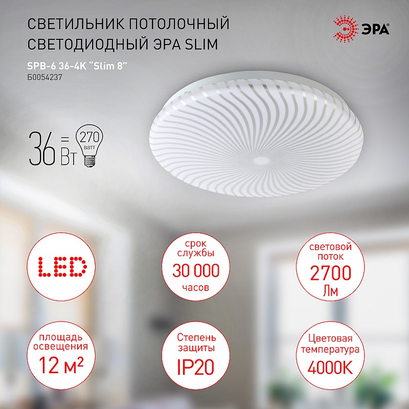 <p>Потолочный светильник SPB-6 "Slim 8" мощностью 36 Вт от бренда ЭРА в нежном белом оттенке надежно впишется в любое дизайнерское решение!<br />