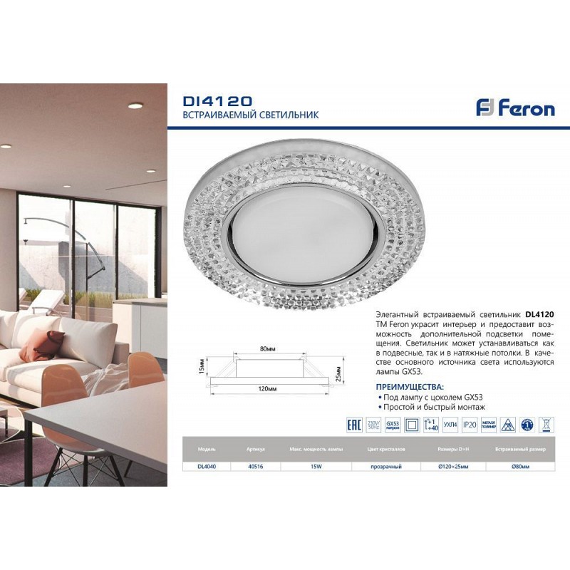 Светильник потолочный встраиваемый (ФВО) FERON DL4120, под лампу GX53 GX53, прозрачный хром, круг, 120*120*25 мм, монтажный диаметр 80мм, корпус стекло, неповоротный