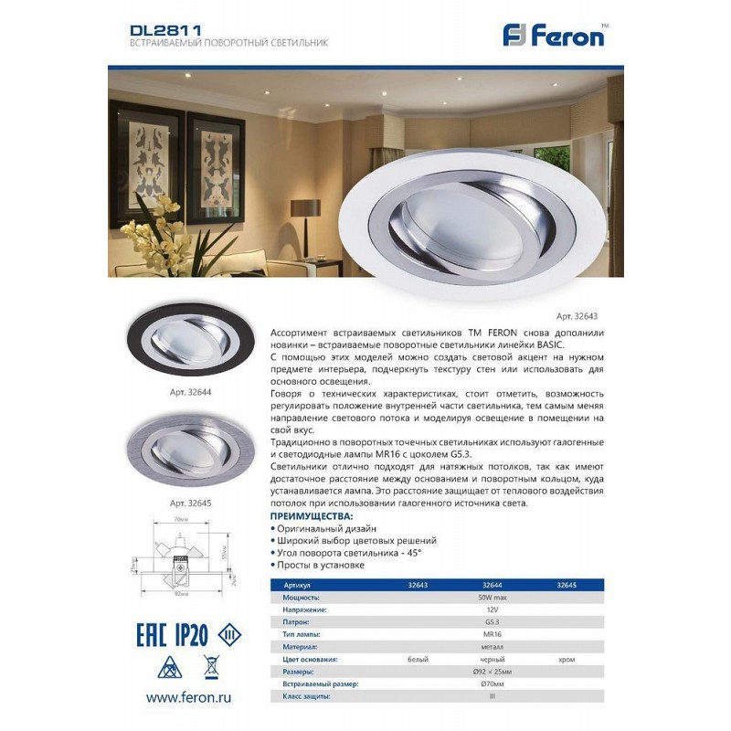 Светильник потолочный встраиваемый (ИВО) FERON DL2811, под лампу MR16 G5.3, черный-хром, круг, 92*92*25 мм, монтажный диаметр 70мм, корпус металл, поворотный