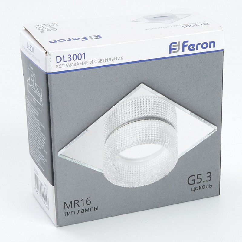 Светильник потолочный встраиваемый (ИВО) FERON DL3001, под лампу MR16 G5.3, прозрачный, квадрат, 95*95*45 мм, монтажный диаметр 67мм, корпус металл+акрил, неповоротный