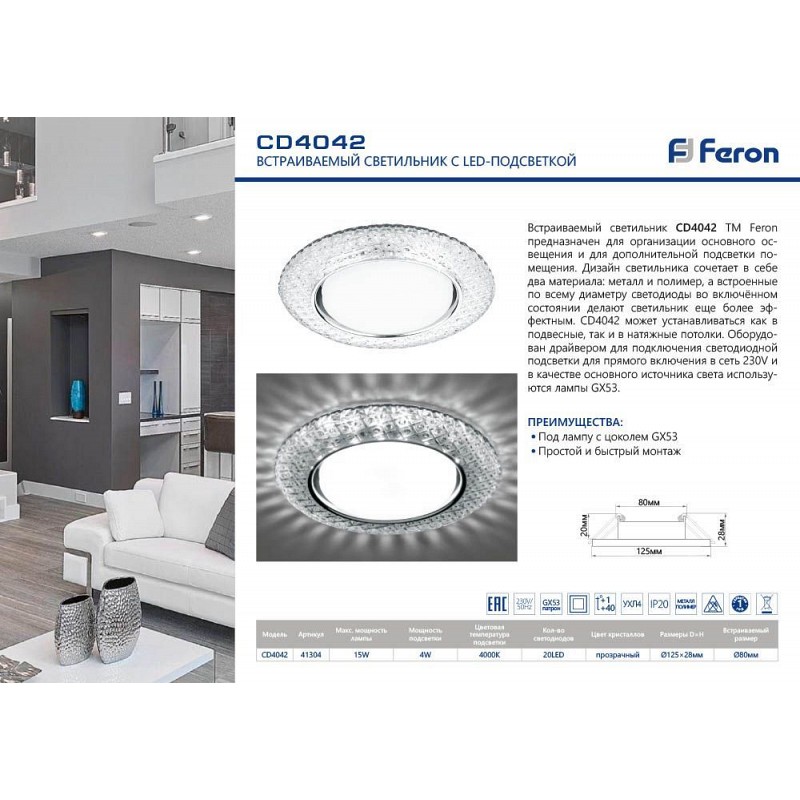 Светильник потолочный встраиваемый (ФВО) FERON CD4042, под лампу с LED подсветкой 20LED*2835 SMD 4000K, GX53 GX53, прозрачный хром, круг, 125*125*28 мм, монтажный диаметр 80мм, корпус полимер, неповоротный