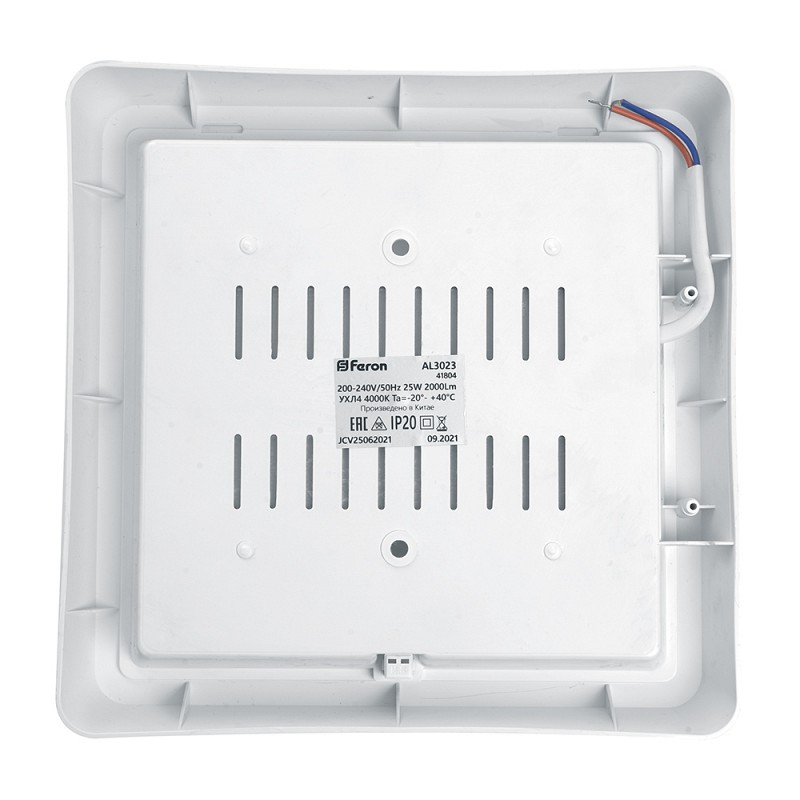Светильник накладной светодиодный, квадрат (ДПБ) FERON AL3021, 25W, 6500К (дневной), 200-240V, 2000Lm, IP20, угол рассеивания 120°, цвет белый, корпус пластик, рассеиватель пластик, 190*190*35