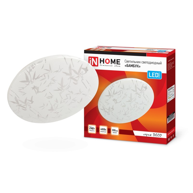 Светодиодный светильник БАМБУК серии DECO ТМ IN HOME в светлом матовом корпусе украшен принтом в виде стилизованных листьев бамбука. Согласно древнему китайскому учению фен-шуй, изображение этого растения приносит в дом удачу, счастье и процветание. Линейка светильников БАМБУК представлена в трех размерах от 190 до 350 мм. Несколько вариаций мощности (в диапазоне от 12 Вт до 36 Вт) позволяют подобрать оптимальный осветительный прибор, в зависимости от конфигурации и габаритов помещения. Применение Светодиодные светильники БАМБУК серии DECO предназначены для внутреннего освещения жилых помещений, подъездов и сферы ЖКХ, офисных и административных учреждений, магазинов, а также холлов, коридоров, лестничных пролётов, подсобок и других помещений вспомогательного назначения. Преимущества Современные светильники серии DECO, работающие на основе последнего поколения светодиодов, обеспечивают яркий равномерный световой поток при максимальной экономии электроэнергии. Отсутствие пульсации гарантирует сохранность здоровья глаз. Светодиодные светильники являются одним из самых экологически безвредных источников света и не требуют специальной утилизации и переработки. Светильники получили сертификат таможенного союза EAC. Производятся по ГОСТу Р МЭК 60598-1-2011. Монтаж Светодиодные светильники серии DECO применяются для работы в сетях переменного тока напряжением 230В ± 10% с частотой 50 герц. Перед установкой следует убедиться в правильности напряжения питающей сети и наличии защитного устройства в цепи (автоматический выключатель, предохранитель). Этапы установки: отключите сетевое напряжение, извлеките светильник из упаковки, открутите плафон светильника, повернув его по часовой стрелке. Через клеммную колодку подключите подготовленные концы проводов осветительного прибора к проводу сети. Установите светильник на поверхности и зафиксируйте при помощи дюбелей и саморезов. Сборку светильника следует осуществлять в обратной последовательности.