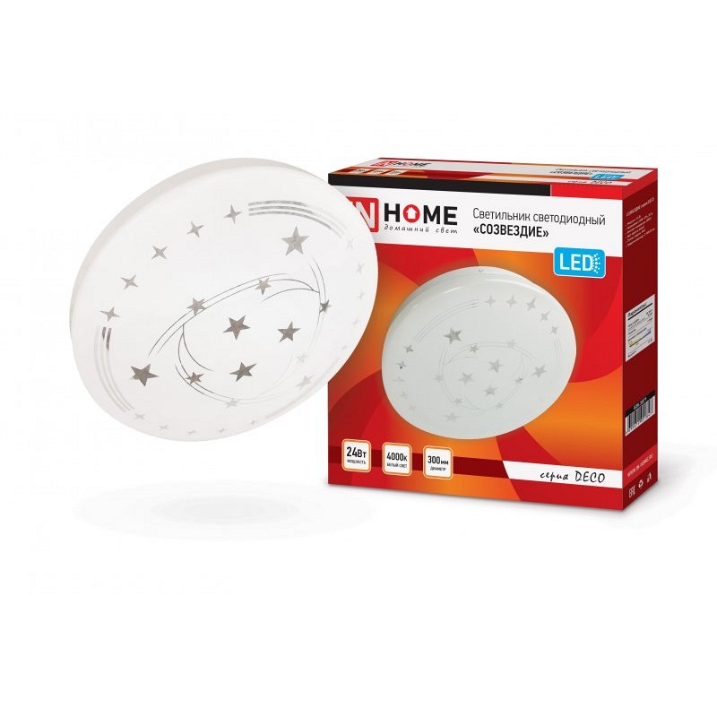 Светодиодный светильник серии DECO ТМ IN HOME с динамичным рисунком в виде хоровода созвездий станет удачным дополнением жилого интерьера. Линейка светильников СОЗВЕЗДИЕ представлена в диапазоне мощностей от 12 Вт до 48 Вт, что позволяют подобрать оптимальный осветительный прибор, в зависимости от конфигурации и габаритов помещения. Светодиодные светильники СОЗВЕЗДИЕ серии DECO предназначены для внутреннего освещения жилых помещений, подъездов и сферы ЖКХ, офисных и административных учреждений, магазинов, а также холлов, коридоров, лестничных пролётов, подсобок и других помещений вспомогательного назначения. Современные светильники серии DECO, работающие на основе последнего поколения светодиодов, обеспечивают яркий равномерный световой поток при максимальной экономии электроэнергии. Отсутствие пульсации гарантирует сохранность здоровья глаз. Светодиодные светильники являются одним из самых экологически безвредных источников света и не требуют специальной утилизации и переработки.