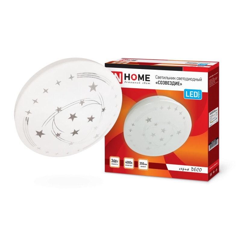 Светодиодный светильник серии DECO ТМ IN HOME с динамичным рисунком в виде хоровода созвездий станет удачным дополнением жилого интерьера. Линейка светильников СОЗВЕЗДИЕ представлена в диапазоне мощностей от 12 Вт до 48 Вт, что позволяют подобрать оптимальный осветительный прибор, в зависимости от конфигурации и габаритов помещения. Светодиодные светильники СОЗВЕЗДИЕ серии DECO предназначены для внутреннего освещения жилых помещений, подъездов и сферы ЖКХ, офисных и административных учреждений, магазинов, а также холлов, коридоров, лестничных пролётов, подсобок и других помещений вспомогательного назначения. Современные светильники серии DECO, работающие на основе последнего поколения светодиодов, обеспечивают яркий равномерный световой поток при максимальной экономии электроэнергии. Отсутствие пульсации гарантирует сохранность здоровья глаз. Светодиодные светильники являются одним из самых экологически безвредных источников света и не требуют специальной утилизации и переработки.