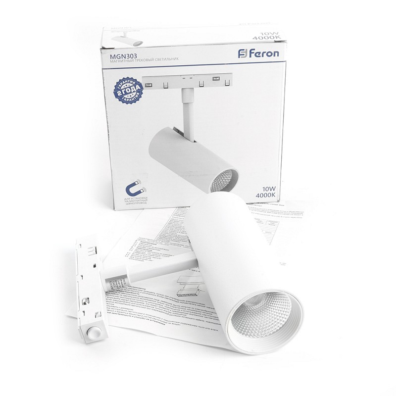 Светильник трековый на шинопровод, - (ДПО) FERON MGN303, 10W, 4000К (белый), 48V, 900Lm, цвет белый, корпус алюминий, рассеиватель поликарбонат, вращение →350°/↓90°, 145*130*55 мм