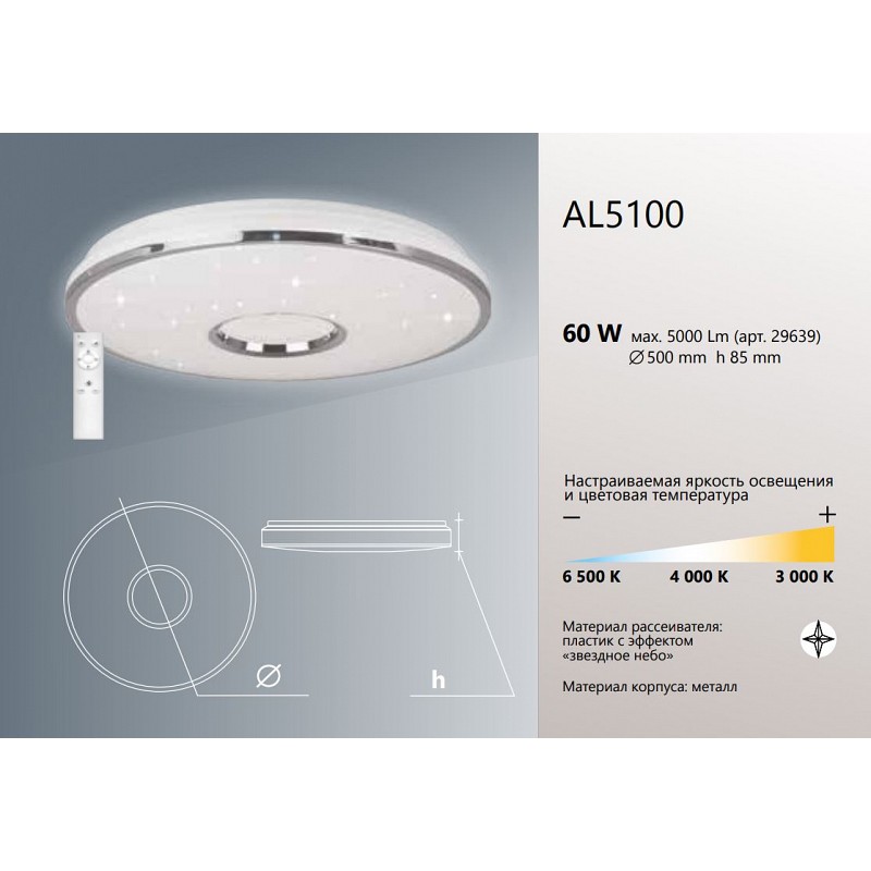 Светильник светодиодный управляемый с пультом, с батарейками 2*ААА, 70W, Max. 5300Lum, 3000К-6000K, IP20, AL5100 GLORY, поставляются в комплекте с пультом и батарейками для него (2 шт), 4627175445793