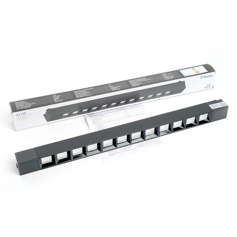 Светильник трековый на шинопровод, однофазный (ДПО) FERON AL130, 30W, 4000К (белый), 170-265V, 2700Lm, цвет черный, корпус алюминий, рассеиватель пластик, вращение →0°/↓0°, 478*33*41 мм