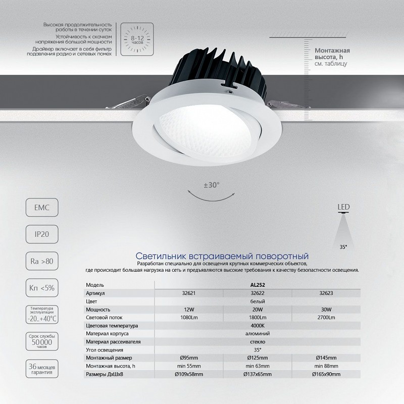 Светильник встраиваемый светодиодный 12W, 1080Lm, 4000K, 35 градусов, белый, AL252 с драйвером в комплекте
