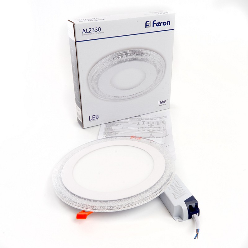 Светильник встраиваемый светодиодный, с синей LED подсветкой (ДВО) FERON AL2330, 16W 4000К (белый), 175-265V, 1280Lm, IP20, угол рассеивания 120°, цвет белый, корпус алюминий, рассеиватель матовый акриловый полимер, 196*196*28.5 мм, монтажн.отв. 157*157 мм.