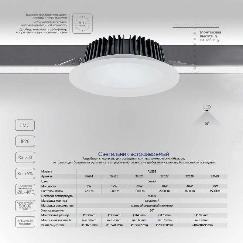 Светильник встраиваемый светодиодный 20W, 1800Lm, 4000K, 90 градусов, белый, AL253 с драйвером в комплекте, 4627153181712