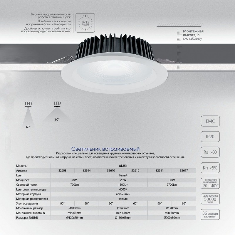 Светильник встраиваемый светодиодный 30W, 2700Lm, 4000K, 60 градусов, белый, AL251 с драйвером в комплекте, 4627153181620