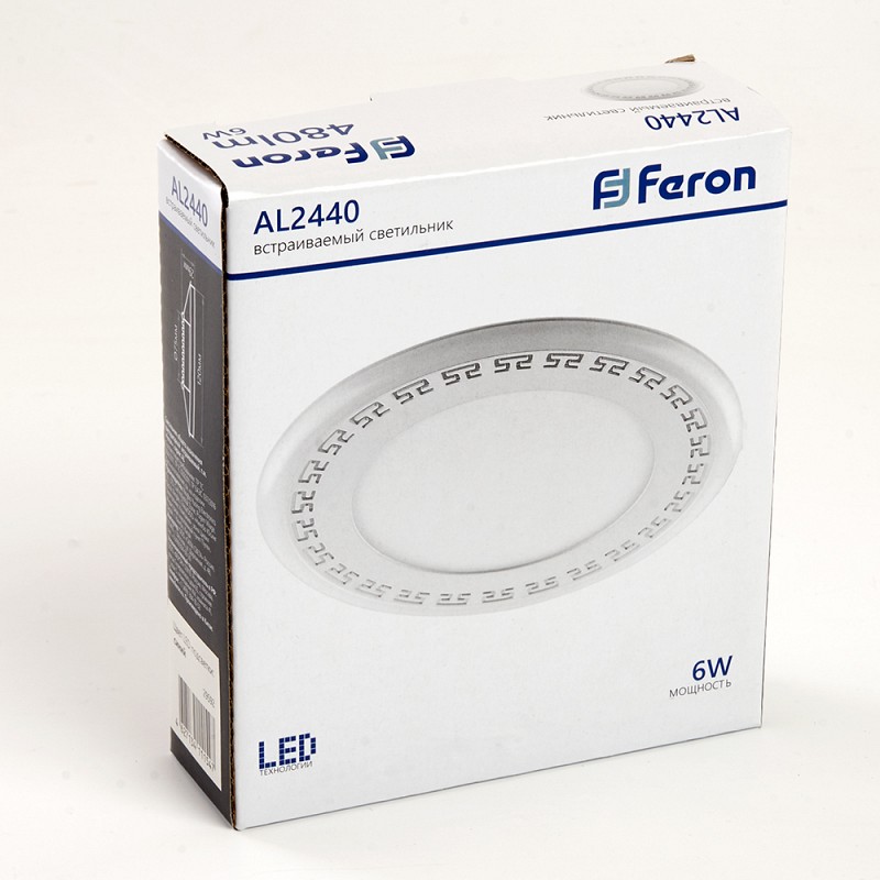 Светильник встраиваемый светодиодный, с синей LED подсветкой (ДВО) FERON AL2440, 6W 4000К (белый), 175-265V, 480Lm, IP20, угол рассеивания 120°, цвет белый, корпус алюминий, рассеиватель матовый акриловый полимер, 120*120*28.5 мм, монтажн.отв. 70*70 мм.