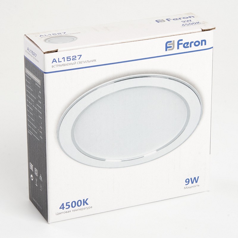 Светильник встраиваемый светодиодный, декоративный (ДВО) FERON AL1527, 9W 4500К (белый), 230V, 720Lm, IP20, угол рассеивания 120°, цвет белый, корпус алюминий, рассеиватель матовый акриловый полимер, 115*115*30 мм, монтажн.отв. 83*83 мм.