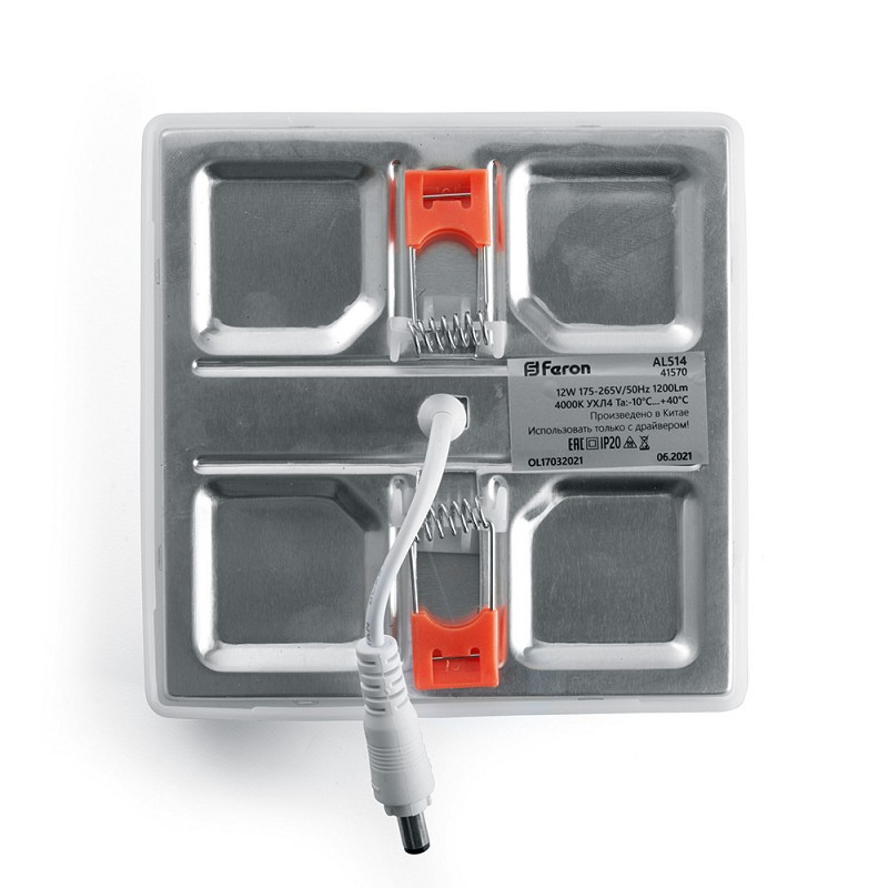 Светильники светодиодные с регулируемым монтажным диаметром, ультратонкий (ДВО) FERON AL514, 6W 4000К (белый), 175-265V, 600Lm, IP20, угол рассеивания 120°, цвет белый, корпус алюминий, рассеиватель пластик, 90*90*20 мм, монтажн.отв. 65*65 мм.