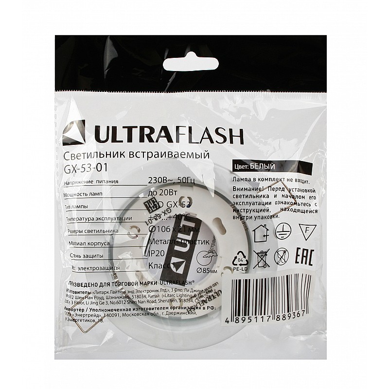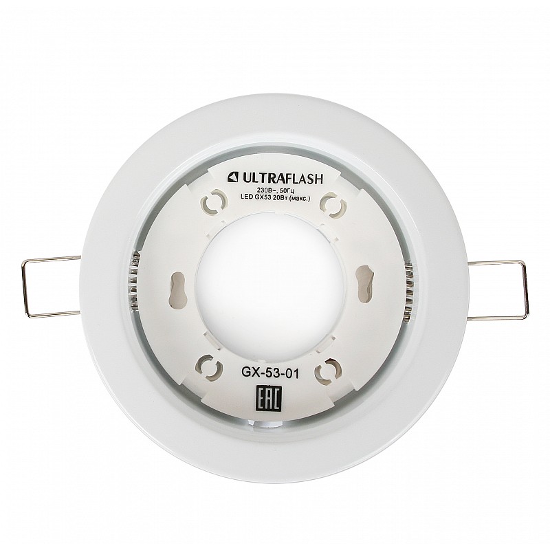 Встраиваемые светильники предназначены для монтажа в подвесные и натяжные потолки, мебель и другие конструкции. Светильник имеет клеммы на пружинах для крепления к поверхности. Ultraflash GX-53-01 белый, размер 21х106х84мм, источник света - лампа GX53, патрон - GX53, материал металл+пластик, мощность до 20 Вт, ~230 В, 50 Гц.